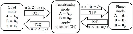 where the state matrix is denoted and , and is also denoted and in the plane, quad and transition modes, respectively. The same indexation logic is used for and the vector represents the potentially faulty actuators in the mode. At each mode, the state matrix is obtained by partial differentiation of the function f with respect to the state vector at a trim condition for the mode.