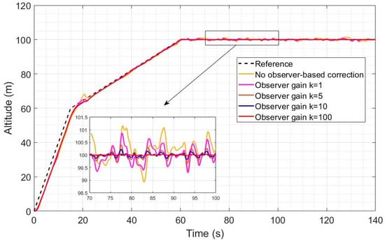 The altitude and velocity IAE results for the observer-based LQR controllers with disturbance and fault rejection are summarised in Table 4, with a comparison against standard setpoint tracking LQR. With AVOECR, the altitude IAE and velocity IAE are reduced by a factor of 4.41 and 4.55, respectively, compared to LQR without observer correction. Compared to the best alternative observer (OEIO), AVOECR reduces the altitude IAE and velocity IAE by 30% and 32%, respectively.