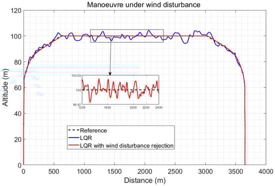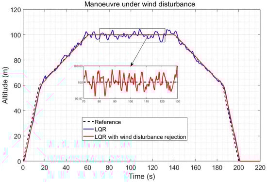The integrated control inputs over the simulation times of the climb cruise-land manoeuvre are given in Table 6 for the wind disturbance rejection comparison and in Table 7 for the wind and fault rejection comparison. It can be observed that even though the observer-based compensation naturally slightly increases overall integrated inputs (in absolute value), the increase is very moderate, from less than 1% for throttle to a maximum increase of 12.8% for the quad pitching moment, which is typically a practically feasible increase to achieve a much finer trajectory tracking. Using alternative observers, the added control effort was between the relatively close LQR and AVOECR-LQR values, but trajectory tracking was well below the performance obtained with AVOECR.
