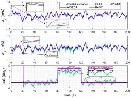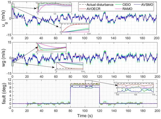 The actuator fault scenario under consideration in this section is an intermittent 10 degrees elevator fault between t = 80 s and t = 120 s, using a Dryden model for the wind velocities with a 5 m/s average wind intensity and the observer-based controller of Section 4.2. Scalar observer gains are used in all observers to make a fair comparison simpler. In Figure 12, all observers are compared to our proposed AVOECR approach, using the same observer gain of k = 100, except for AVSMO, for which gains are reduced to alleviate the chattering. For this scenario, the AVOECR clearly outperforms all other observers with finer accuracy for the estimation of both wind velocities and the fault. The OEIO observer is second best for the wind velocities estimation and performs slightly better than the RAMO when the fault is active, but increases fault estimation error when the fault is not present. All observers perform well in terms of wind perturbation estimation, but there is a significant error on the fault estimation compared to the AVOECR. Figure 13 shows a similar comparison where all alternative observers are allowed higher gains but keep k = 100 with AVOECR. Increasing gains of the three alternative observers causes a degradation in fault estimation. With the RAMO observer, increasing gains reduces the bias error on fault estimation, but the estimation remains noisy compared to the AVOECR, with large spikes at the mode transition times. With OEIO, higher gains cause significantly higher oscillations in the fault estimation. With AVSMO, increasing gains slightly reduces oscillations but does not significantly change the bias. Smaller spikes are observed at the transition times. Increasing the AVSMO gains even further cause the estimation performance to be too significantly degraded with chattering and spikes, so it was not included in the figure. In Table 3, the AVOECR clearly outperforms all three alternative observers in terms of IAE for the combined fault and wind velocities rejection scenario, whether equivalent gains are used (with improvement by a factor of 2.28 to 44.7, depending on the perturbation component and observer) or when alternative observers are allowed higher gains. Increasing the gains of alternative observers reduces the IAE of the wind perturbations but increases the fault IAE, especially with the OEIO observer.