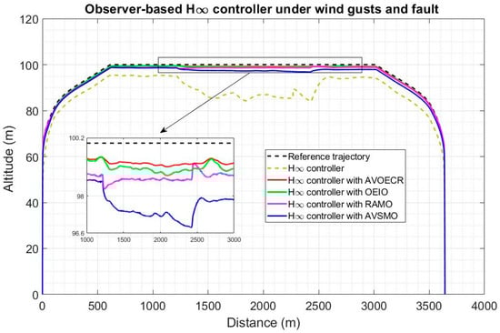 The altitude and velocity IAE results for the observer-based H∞ controllers with disturbance and fault rejection are summarised in Table 5, with a comparison against H∞ trajectory tracking. Using AVOECR, the altitude IAE and velocity IAE are reduced by 8% and 28%, respectively, compared to the second-best observer (OEIO-H∞). Compared to standard H∞ control without an observer, the altitude IAE and velocity IAE are reduced by factors of 3.41 and 3.96, respectively.