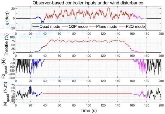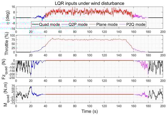 The control inputs of the quadplane using reference following LQR and using the augmented LQR with observer-based wind disturbance rejection are shown in Figure 16 and Figure 17, respectively, for the above two climb-cruise-land flight of Figure 10 and Figure 11. The wind disturbance observer adds a contribution to the control inputs, but the increase in energy consumption is low compared to the pronounced improvement in trajectory tracking accuracy, rapidity and robustness to winds. The high-frequency components of the control inputs were verified to be feasible with both controllers. They are mainly used to compensate the higher frequency components of the wind gusts. The disturbance rejection controller compensates more efficiently for the lower frequencies of the wind gusts.