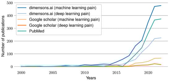 Artificial intelligence and particularly deep learning methods have achieved outstanding results for various Machine Learning (ML) tasks in the past few years. In particular, modern Deep Learning (DL) architectures yield results that are equivalent to human performance for image classification and sometimes even outperform them. It is therefore not surprising that attempts were made to develop ML models that compete with experts in their respective fields. For example, in the area of medicine, automated systems have been built to classify skin cancer [1], segment Optical Coherence Tomography (OCT) images [2], classify COVID-19 patients from chest CT images [3], classify Parkinson’s disease based on audio files [4] and many more to replace or enhance their current gold standard based on expert knowledge. Moreover, the increasing simplicity to acquire physiological sensor data by using cheap and simple-to-use wearables has opened completely new research areas such as automated emotion recognition [5], sleep stage classification [6], Human Activity Recognition (HAR) [7], hunger detection [8], and countless others. Similarly, efforts were undertaken to automatize the clinical recognition of pain. As pain constitutes both a symptom and disease [9], it is a crucial indicator in any medical application. Currently, the gold standard for pain detection is represented by Numerical Rating Scales (NRSs), which ask patients about the pain they felt using a numerical scale between 0 and 10 and its corresponding anchors “no pain” and “worst imaginable pain”. While there are several versions of this concept, such as Visual Analogue Scales (VASs) or special types of scales targeted for children (Faces Pain Scale) [10], and even pain observation tools used for patients with disorders of consciousness such as the Nociception Coma Scale (NCS) [11], these questionnaires have several drawbacks. On the one hand, pain is a highly subjective concept that is hard to communicate and is influenced by past experiences. On the other hand, even accurate estimates of pain identified by the gold standard are sporadic rather than continuous measurements. Further, these questionnaires fail whenever patients are unable to (reliably) communicate their pain, such as with coma patients, elderly (dementia) patients or children. Thus, various medical applications would benefit from a continuous, objective and automated pain recognition system. In the past, several attempts to build such systems were made by training a ML model to associate physiological signals with their corresponding pain categories. Initial efforts relied on the use of classical ML models trained on features obtained from expert knowledge, such as Support Vector Machines (SVMs) [12]. More recent publications evaluated the use of DL approaches to overcome the need for explicit expertise in pain physiology [13]. Figure 1 summarizes the current trend of work in the area of automated pain assessment. It visualizes the number of published papers for each year since 2000 that were found through different search engines. A search using the website “dimensions.ai” in combination with the search keys “machine learning pain” and “deep learning pain” in the title and abstract was conducted. In addition, a PubMed search was performed with “pain machine learning[title/abstract]” as the search term. Furthermore, a Google Scholar retrieval for “machine learning pain” and “deep learning pain” was performed (searching for papers having all keywords in the title). The results show an increasing amount of publications over time, which reflects the rise of interest and importance of the research field in recent years.