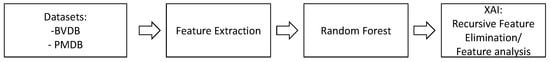 The flow of the applied feature engineering techniques. Initially, features are computed for the raw data samples of the PainMonit Database (PMDB) and BioVid Heat Pain Database (BVDB) datasets. Next, Random Forest (RF) models are trained for automated pain classification. Finally, the decision process is analysed using techniques of Explainable Artificial Intelligence, e.g., Recursive Feature Elimination (RFE).