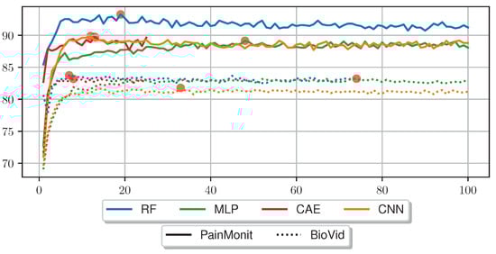 To have a direct comparison between RF with HCFs and the DL models and to enable RFE for the latter, a combination of DL and RF models was implemented in addition to the end-to-end evaluation. It was realised by training DL models in an end-to-end manner, discarding the last classification layer and feeding the output as features to a RF model. The DL models were implemented using Keras 2.7 and trained with a batch size of 32, a learning rate set to and on 100 epochs if not otherwise mentioned. EDA data samples were given to the models as a 3D shape in the form (time × sensor channels × 1) with one sensor channel (EDA) and the time steps according to the sampling rate and window size of the datasets. The resulting windows had the shape (2500 × 1 × 1) and (2816 × 1 × 1) for the PMDB and BVDB, respectively. To process the 3D data, 2D convolutions were used with kernel, pool and stride sizes equal to (n, 1), with n being the kernel size across the time dimension as defined in Table A1, Table A2, Table A3 and Table A4. As the only exception, the unsupervised pre-training step of the CAE was performed with a batch size of 8. Dropout layers were used in most architectures to avoid overfitting on the training sets. ML have been evaluated on a machine with an i7-7700K CPU, 16 RAM and Geforce GTX 1080 Ti.