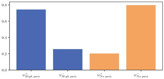 Similarly to Figure 10 and Figure 11, Figure A2 and Figure A3 show the outcome of Grad-CAM for one subject. In contrast to previously shown images, the proposed CNN model performs poorly for the chosen model (53.33% accuracy). Nevertheless, similar findings can be seen. While class activations highlight areas with a negative slope when calculated with respect to the “no pain” class, areas with a positive slope are highlighted with respect to the class “high pain”. Thus, it can be assumed that this simple relationship seen in Figure 10 and Figure 11 and highlighted in Figure 12 is present in each subject’s data regardless of the CNN classification performance.