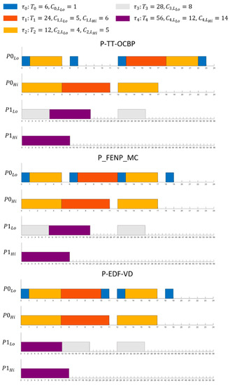 An example of a task set is provided in Table 4 in order to illustrate the execution of our scheduling algorithm on a platform with two processors. The same task set is scheduled in Figure 2 using P-EDF-VD and P_FENP_MC for comparison.