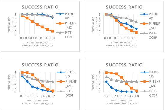 The experimental results show that our algorithm has a high success ratio when the number of processors is low. The higher the number of processors, the lower the success ratio due to the increased total utilization on each processor (the number of tasks scheduled on a processor is determined by the utilization bound). P-TT-OCBP outperforms the other two algorithms in terms of success ratio when the number of processors is low; however, if the number of processors increases, P_FENP_MC performs better due to the additional mapping test executed while partitioning tasks to processors.