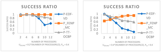 In Figure 5, the task set base utilization bound (BUbound) ranges on the x-axis from 0.2 to 0.8, in steps of 0.1. It can be seen that the performance of the algorithm decreases when the number of processors increases. This is because the FFD heuristic, presented in Section 4.3 of this paper, allocates tasks on a processor as long as the total utilization of the processor is lower than or equal to 1. Since the utilization bound is higher when the number of processors increases, there is a higher chance of the task mapping being unsuccessful or the scheduling algorithm at the processor level failing.
