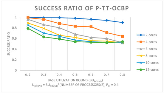 Success ratio of P-TT-OCBP by varying the base utilization bound and the number of processors. UL = 0.05, UU = 0.75, ZL = 1, ZU = 4.