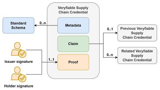 In the proposed model, we extend the verifiable credential outlined in Section 3.1 for asset tracking (e.g., pharmaceutical products) with blockchain-based supply chains. Such a model enables interoperability in terms of all the alterations related to the tracked assets, registered in various blockchain-based supply chain systems. These alterations can be cryptographically verified. At the core of the model is a dedicated verifiable credential named the Verifiable Supply Chain Credential (VSCC), depicted in Figure 1.