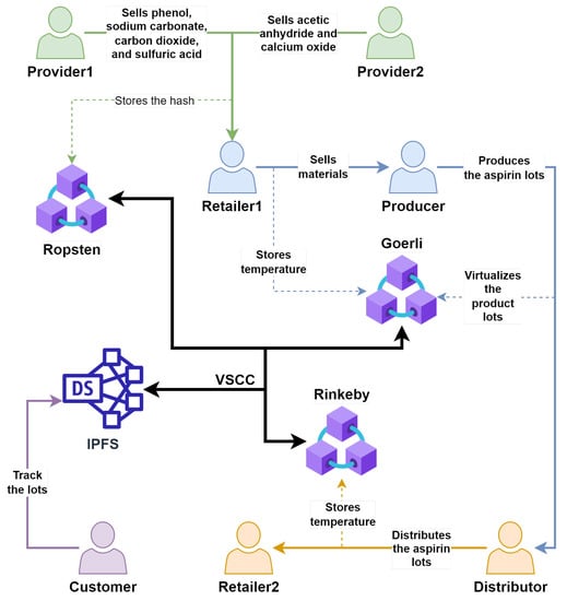 To evaluate the proposed model, its application has been simulated. The pharmacy sector has been chosen as the case scenario, specifically, an aspirin manufacturing supply chain, using different blockchain technologies at each of the stages of the process. The process consists of obtaining and transforming chemicals, such as phenol and sodium carbonate, into acetylsalicylic acid, commonly known as aspirin, apt for human consumption. The steps followed in the described scenario are production, packaging, distribution, and retail sale. For each stage, a certificate is needed that guarantees the quality of the pharmaceutical product, especially at the production stage, where the product needs four chemical reactions, each having its own parameters [33]. The reactions consist of five steps: (i) the storage of the chemicals, (ii) preparation, (iii) reaction, (iv) purification, and (v) the storage of the product.