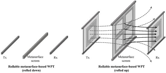 Given the aforementioned advantages, the proposed rollable MS-based WPT system can be applied to various scenarios. For example, the Rx of the WPT system can be directly applied to flexible or rollable electronics. The rollable Tx and MS screens can be rolled down, e.g., onto the table or ceiling when they are not used, and, thus, do not require any designated space. Then, end users charge the Rx with high efficiency by rolling up the Tx and MS screens only when needed. The number of MS screens can be determined depending on the application. In addition, the users can carry the rollable MS-based WPT system as it is in small size when rolled down. Then, users can set up the WPT systems and charge their devices as needed. If high-efficiency charging is required, the additional MS screens can be inserted between Tx and Rx.
