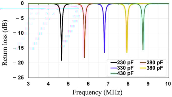 First, the rollable WPT system (Tx/Rx) was engineered as depicted in Figure 2a. The proposed WPT is composed of the Tx and the Rx coils which were fabricated on a thin and flexible polyethylene (. The thicknesses of the polyethylene substrate and copper were 0.076 mm and 0.079 mm, respectively. The thickness of the copper layer is thicker than the three skin depths of the copper at 6.78 MHz. As the rollable WPT system has thin substrate and conductor layers, it is flexible and easy to roll. In addition, in order to realize the planar Tx and Rx structures, both the Tx and Rx coils were engineered with the utilization of a 3-turn spiral and single-turn loop on the same side of the substrate. The single-turn loop acts as source/load coils and the inner 3-turn spiral acts as Tx/Rx coils of the traditional 4-coil WPT system. Table 1 shows the dimensions of the Tx, Rx, and MS unit cell. The lumped capacitors (330 pF) were parallelly connected to Tx/Rx elements to realize the magnetic resonance coupling WPT at 6.78 MHz. High Frequency Structure Simulator (HFSS, Ansys Inc., Canonsburg, PA, USA) was used to simulate and fine tune the designed WPT. After the dimensions of the Tx/Rx were designed, the value of the capacitor was swept from 230 to 430 pF, as shown in Figure 3. Based on the results, a 330 pF capacitor was chosen to be connected to Tx/Rx. Figure 4 depicts the simulated and measured return losses of the Tx and Rx with connected capacitor. It is shown that the simulated and measured return losses match very well.