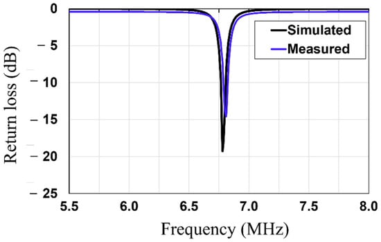 Simulated and measured return losses of the Tx/Rx coils.