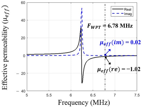 where is the impedance; S11 and S21 are the reflection and transmission coefficients; is the thickness of the screen at its thickest spot; and indicate the real part and imaginary part of the complex numbers; is the effective refractive index; is the wavenumber; is the integer correlated with the branch index of ; and is the effective magnetic permeability. The real part of the effective permeability reflects the refractive index, which implies the direction of the magnetic field by the boundary conditions, and the imaginary part represents the magnetic loss []. The desired effective refractive index value was carefully designed by sweeping the value of the connected capacitor in HFSS, as shown in Figure 5. The capacitance value of 360 pF was determined to achieve the negative refractive index at 6.78 MHz. In the simulation results (Figure 6), the real part of the effective permeability was engineered to be −1.01 at 6.78 MHz, which means it has an effective refractive index value of −1.01. The imaginary part of the effective permeability is shown to be 0.01, which shows it has a comparably low magnetic loss. The simulated results indicate that the MS screen changes the direction of the magnetic field at the boundary to negative, thereby magnifying the PTE of the WPT at 6.78 MHz.