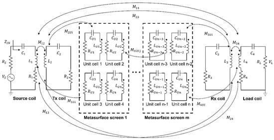 The equivalent circuit of the proposed rollable MS-based WPT system was modeled and analyzed, as depicted in Figure 7. The rollable WPT was modeled as a 4-coil WPT. In this work, multiple MS screens were added between Tx and Rx for the high PTE. The multiple MS screens can be inserted without taking up any dedicated space because of their rollability. The parameters of each element are expressed using RLC models. The system equations of the equivalent circuit can be analyzed using Kirchhoff’s voltage law (KVL), as described in Equation (5), where , , and are the source voltage, current, and resistance; , , , and are the resistance, inductance, and capacitance, current of each element k is the mutual coupling between two elements x and y .