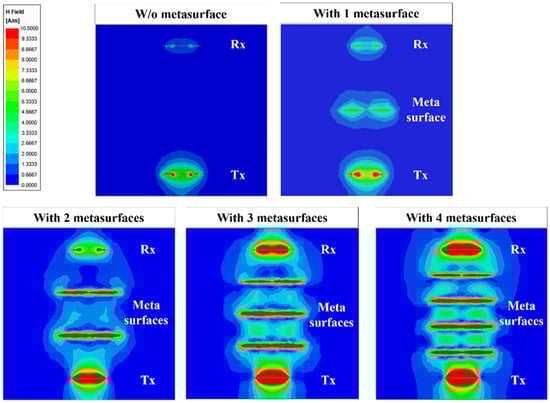 Comparison of magnetic-field distribution between the Tx and Rx without and with the MS screens.