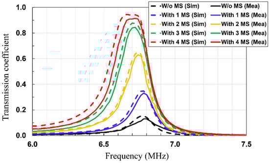 In addition, the transmission coefficients (S21) of the WPT system without and with MS screens are simulated and measured at a PTD of 60 cm (Figure 9). As shown in Figure 9, the values of the transmission coefficients are greatly increased when the MS screens are inserted. These results are consistent with the ones in the magnetic-field distribution analysis. Moreover, it is observed that the resonant frequency of the rollable WPT shifts down more when the additional MS screens are inserted, as the more mutual inductance between the MS screens and Tx/Rx is induced. It is shown that the simulated and measured transmission coefficients match very well.
