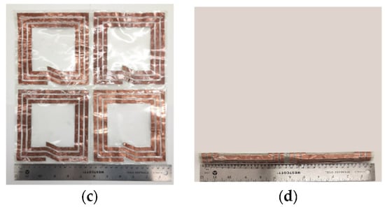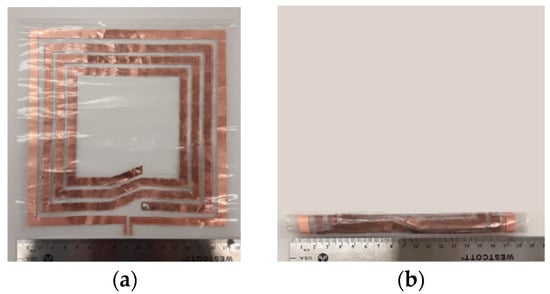 Another thing to be considered is the recent technology trend of decreased size, weight, and power (SWaP) that the modern WPT systems should follow. Specifically, for the efficient utilization of space, modern commercial electronic devices change their form factors and are deformed, folded, and rolled, e.g., foldable, flipped phones, and rollable televisions, without degrading the performance of the electronic devices while promoting their portability. In this respect, previously demonstrated WPT systems utilizing MTMs have not been compliant with this trend, as their structures have been thick, huge, or rigid [,,,,,,,,] for modern electronic devices. In our previous work [], a rollable MTM screen for a high-efficiency WPT system was designed at 4.5 MHz, where only the MTM screen was rollable, while the source, Tx, Rx, and load coils were made of non-planar and non-rollable rigid structures. This implies that the Tx and Rx coils still occupied space when they were not in operation. In addition, the size of the WPT system was quite big, with an operating frequency of 4.5 MHz, being less practical and not being compliant with a standard frequency such as 6.78 MHz (AirFuel Alliance standard frequency).