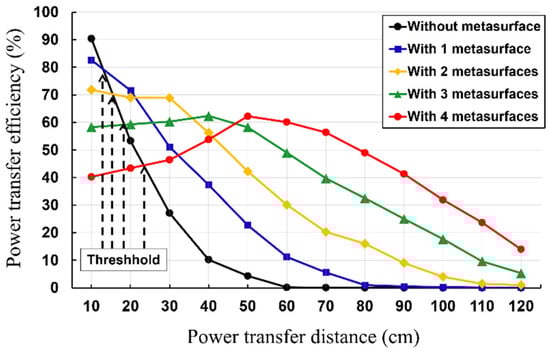 As depicted in Figure 12 are the threshold distances, beyond which the rollable WPT with the MS screen exhibits magnified PTE. The reason for this phenomenon is that the mutual inductance between the MS screens and Tx/Rx elements increases as the PTD decreases. Hence, as the PTD decreases, the resonant frequency of the rollable WPT is shifted, thereby degrading the PTE. Moreover, it should be noted that the threshold distance increases as more MS screens are inserted. The reason for this phenomenon is that the resonant frequency of the rollable WPT shifts more when the additional MS screens are inserted, as more mutual inductance between the MS screens and Tx/Rx elements is induced. Therefore, the WPT system additional MS screens require a longer threshold point for recovering the resonant frequency of the WPT system. This also means that the optimum number of MS screens should be determined depending on the PTD. For example, the optimum number of the MS screens at the PTD of 30 cm is two as the PTEs of the WPT system with more than two MS screens are lower than that with 2 MS screens due to the shifted resonant frequency.