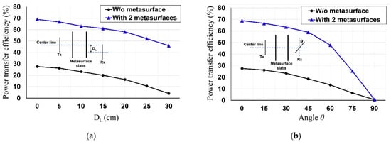 Here, the effects of the misalignments of the PTE of the rollable MS-based WPT are investigated. We explored the effects of the lateral and angular misalignments on the PTE of the rollable MS-based WPT without and with two MS screens at a transfer distance of 30 cm. In Figure 13a, as the misaligned lateral distance (DL) increases, the PTE of the rollable MS-based WPT decreases for both scenarios (without and with the MS screens). However, it is worth noting that the PTE increases significantly for the entire DL when the MS screens are rolled up. Furthermore, the investigations of the angular misalignment (θ) are also depicted in Figure 13b. When the angle of the Rx increases, the PTE of the rollable WPT without and with the MS screens is degraded. It is shown that the impacts of the MS screens on the PTE of the rollable WPT decrease as the angular misalignment becomes worse. In particular, the magnified PTE due to the MS screens is close to 0% when the angular misalignment is 90°. This implies that the magnetic fields induced by the Tx can not be transmitted to the Rx when the misaligned angle is 90°, even if the magnetic fields are magnified and focused by the MS screens. In spite of this phenomenon, it is proved that the MS screens recompense the effects of the misalignments on the WPT.