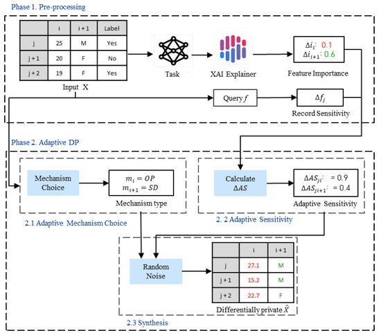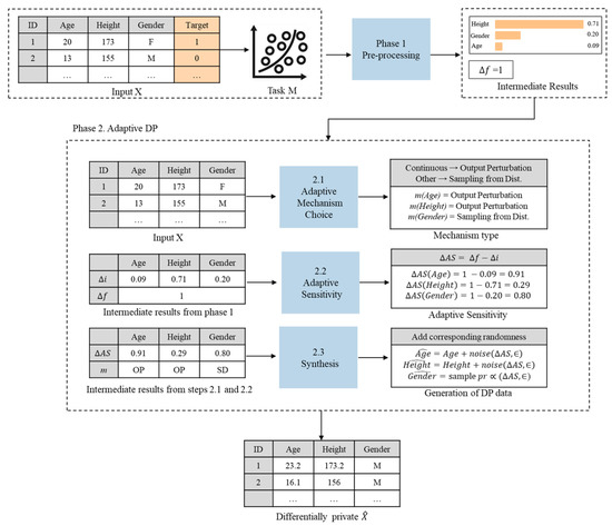 In Figure 2, we show an example that describes the overall operation of the proposed task-specific adaptive DP method for structured data. In phase 1, for the given input data X, feature importance for each attribute i and record sensitivity for the jth record are computed. In phase 2, after we choose the differential private mechanism and calculate adaptive sensitivity using the given and , we generate the noisy data .
