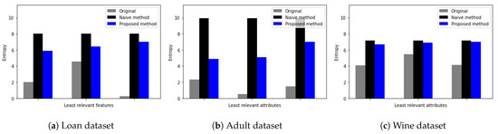 Furthermore, from Figure 5a–c, we observe that entropy values of least relevant attributes with random noise added by the proposed DP method are similar to entropy values with random noise added by the naive DP method. These observations imply that for the least relevant attributes, original entropy values are different from the entropy values of the proposed DP method and the naive DP method.