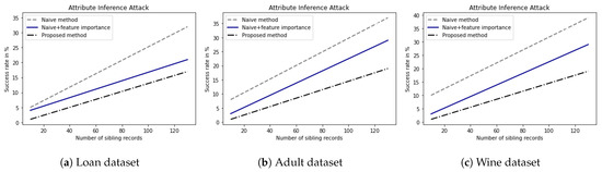 AIA success rate for (a) Loan dataset [24], (b) Adult dataset [30], and (c) Red Wine quality dataset [27].