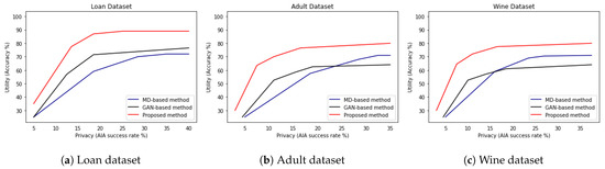 In Figure 7, we show privacy–utility trade-off curves of the proposed DP method and two well-known differentially private data publishing methods [10,14]. Let us note that we are interested in maximizing accuracy while minimizing the success rate of the modified AIA and thus, providing a high utility and privacy guarantee. In Figure 7a for the loan dataset, we observe that MD-based method [10] depicted by blue color shows the highest privacy–utility trade-off and GAN-based method [14] depicted by black color shows slightly lower privacy–utility trade-off, while the proposed DP method depicted by red color shows lowest privacy–utility trade-off. Furthermore, in Figure 7b for the adult dataset and Figure 7c for the red wine quality dataset, we observe that compared to both MD-based and GAN-based methods, the proposed DP method shows the lowest privacy–utility trade-off. These observations imply that the proposed DP method maximizes accuracy while minimizing the success rate of the modified AIA and thus, provides a high utility and privacy guarantee.