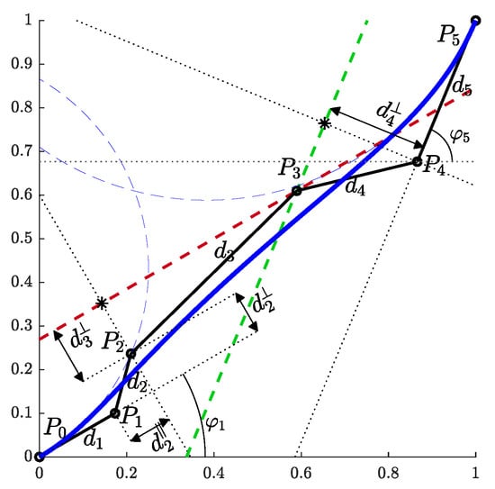 With the above notation, let us mark the distances between consecutive control points as and the angles between () and the positive direction of the x-axis as (Figure 2), . For the coordinates of two consecutive control points, it follows that: