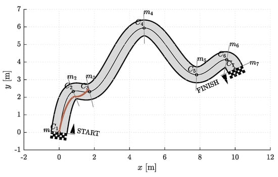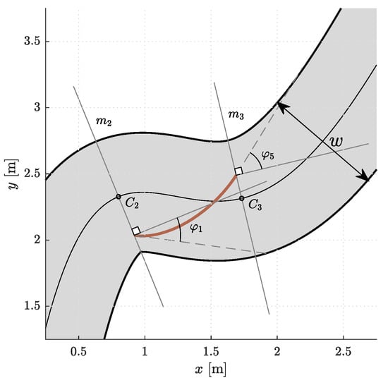 The model of a racetrack that we used in our simulations is shown in Figure 3. It is defined by the centerline. The left and right edges of the racetrack are at a distance from the centerline and represent the corridor boundaries. The shape of the racetrack can in general be arbitrary complex and is therefore divided into segments. This is done by analyzing the curvature of the centerline. Points where the curvature reaches local extrema are denoted by the sequence , where is the number of segments. Then perpendicular lines to the centerline are drawn in . These lines represent the edges of individual segments. The first and last control points of the Bézier curves lie somewhere on the segment edges. For simplicity, we represent the positions of and , , by the parameter . The sign of p indicates whether the control point lies somewhere between the centerline and the right (+) or left (−) edge of the racetrack.