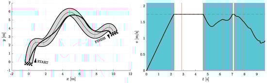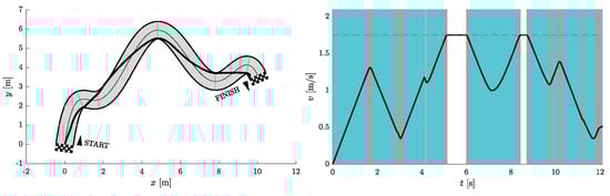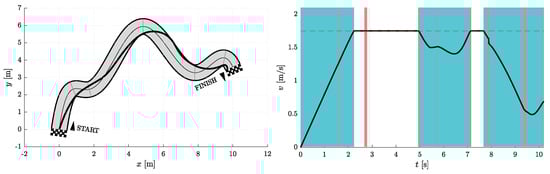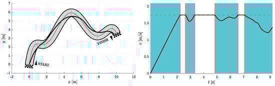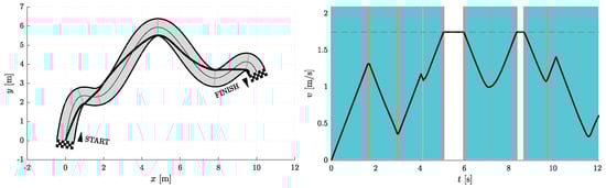 Figure 6, Figure 7, Figure 8, Figure 9, Figure 10 and Figure 11 show the resulting paths in the racetrack and the corresponding velocity profiles. We imposed the following constraints: 1.75 m/s (represented by the dashed horizontal lines), = 1.6 m/s, = 0.8 m/s, = 16 m/s, = 12 m/s.