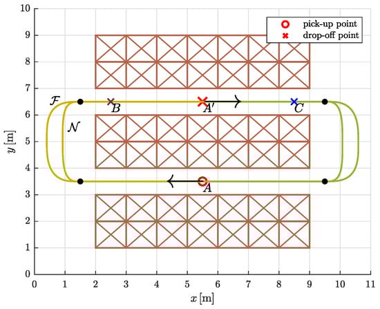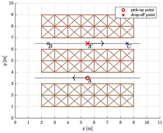 We tested the proposed trajectory planning algorithm in a simple warehouse environment by simulating the task of moving between three rows of storage racks, picking up and dropping off loads from specific locations (Figure 12). Warehouses are usually very confined environments, so we assumed that movement in the two aisles is restricted to a straight line. To avoid collisions of AGVs with storage racks, the straight segments on both sides protrude slightly beyond the edges (black solid dots in Figure 13). The optimization problem is to find the most suitable path shape between the aisles.