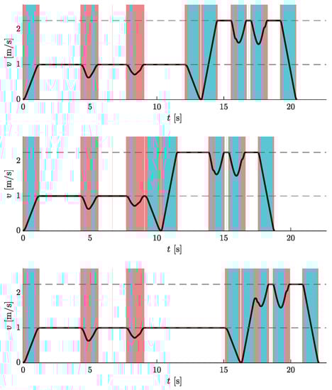 Figure 14 shows the velocity profiles for all three pairs of pick-up and drop-off points for the case where is on the first part and is on the second part of the circular route.
