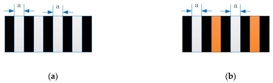 Based on the theoretical calculation, the proposed pattern of the scanning reticle is illustrated in Figure 3b. The orange columns represent the phase grating, while the other parts are identical to the traditional scanning reticle in Figure 3a. The widths of white, gray, and orange columns are set to , and with such an arrangement, the fabrication of the scanning reticle can be greatly simplified.