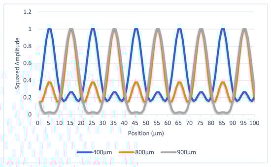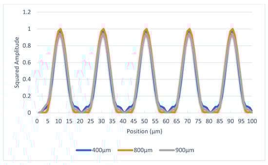 As aforementioned, the objective is to make the distribution of light intensity stable at any position within one Talbot distance. Optical linear encoders equipped with 20 μm pitch period gratings are the most commonly used in the industrial sector. Assuming the pitch lines are equal, then the value of is 10 μm, as seen in Figure 3. The wavelength of the desired LED light source is 875 mm. Based on Equation (1), the Talbot distance is 914 µm under these conditions. From the perspective of practical applications, the distance between the reading head and main scale is usually greater than 400 μm to avoid friction or collisions, and 400 μm is approximately half of the Talbot distance in this optical system. Therefore, gap values are chosen as 400 μm, 800 μm, and 900 μm for theoretical calculation. The scanning reticle can be considered a continual series of light sources, and the distribution of light intensity on the main scale is the composition of all. Because the distribution of light intensity by each light source can be calculated according to Equation (6), the total distribution of light intensity is computable. The data from the scanning reticle made by amplitude grating are given in Figure 5; the phase is reversed at the distance of 400 μm when amplitude grating is applied. As the objective of adding phase grating is to introduce different phases between the light sources on the scanning reticle, the same method of calculation still applies. The trials on the calculation method conclude with the phase shifted by between adjacent light sources; the phase of the light distribution is the most stable with different distances, as illustrated in Figure 6; and the phase of light distribution is the same between 400, 800, and 900 μm mounting gaps.