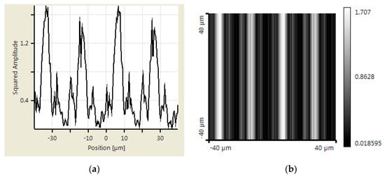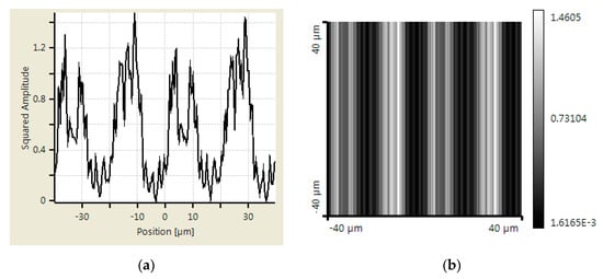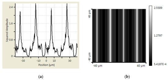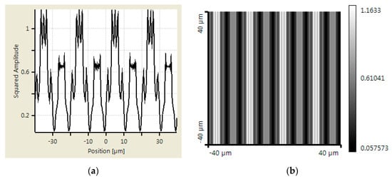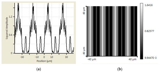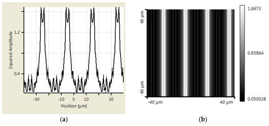 An additional simulation was made using Virtual Lab Fusion to verify the abovementioned calculation results. Virtual Lab Fusion is a simulation platform based on physical optics; it is ideal for simulating complex light propagations. The mounting distance is set as 400, 800, and 900 μm between scanning reticles and the main scale. The results of the scanning reticles made by amplitude grating are demonstrated in Figure 7, Figure 8 and Figure 9, which show the phase of light intensity distribution is unstable at different mounting distances. Figure 7a, Figure 8a and Figure 9a exhibit the single-dimensional distribution of light intensity at the mounting distances of 400, 800, and 900 μm, respectively. The phase of light is identical between Figure 8a and Figure 9a; in contrast, there is a phase difference between the light distribution shown in Figure 7a. The dual dimensional distribution of light intensity is shown by Figure 7b, Figure 8b and Figure 9b. The bright and dark areas in Figure 8b and Figure 9b are identical, but Figure 7b shows the opposite pattern. Moreover, the unexpected light lines with a width of 4 μm appear at the region between bright and dark in Figure 8b, where the variation in phase may impede the formation of the Moire fringe. Based on these simulation results, the image of the diffraction light at 400 μm (close to half of one Talbot distance) is almost reversed compared with the results at 800 and 900 μm (close to one Talbot distance). Such a phenomenon resembles the previous calculation results. The instability of light intensity distribution and phase drift ton signals not only leads to incorrectness in positions but can also be difficult to read by photocells in the reading head. That is to say, no expected output electrical signals can be generated in this case. On the other hand, the phase remains stable, and the bright and dark areas are not swapped in the simulation results of the scanning reticle made by amplitude and phase grating for the distances of 400, 800, and 900 μm (as shown in Figure 10, Figure 11 and Figure 12). The simulations by Virtual Lab Fusion demonstrate that the amplitude and phase grating outperform their counterpart and have good potentiality to keep the distribution of light stable when mounting distance varies.