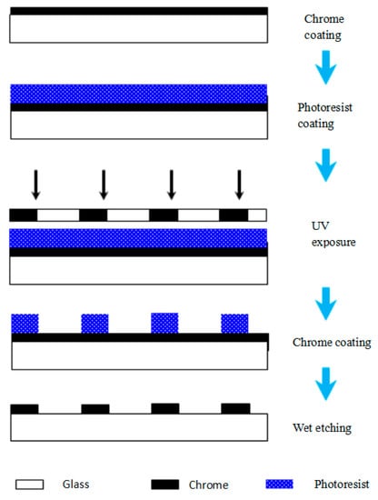The fabrication of the proposed scanning reticle can be completed using two steps. The first step is to fabricate the amplitude grating, which is quite similar to the mainstream technology of making the optical linear encoder’s glass scales nowadays (Figure 13). Step one contains the processes of coating, photolithography, and etching. The chrome is coated onto glass substrates by e-beam evaporation; the uniformity is supposed to be finer than 5%. The source of UV irradiation is a 365 nm wavelength lamp with an exposure of 100 mJ. To make a desirable amplitude grating, all chrome must be etched away in designed areas until the glass substrate is exposed. Meanwhile, timing is critical to ensure the width and straightness of the chrome lines.