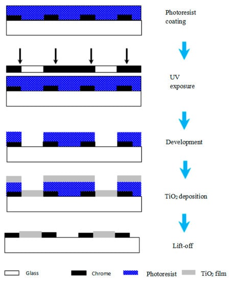 Step two (Figure 14) resembles the previous step. It is noteworthy that the exposure process can only take place after the mask and amplitude grating are perfectly aligned. The accuracy of alignment has a significant impact on the line width and period on the scanning reticle. In this experiment, it was performed under a microscope with an accuracy of ±1 μm for the alignment. After the photolithography process, a transparent film made of TiO2 is deposited onto the scanning reticle. Temperature is critical in this process to prevent the deformation of the photoresist. Finally, the photoresist and the TiO2 film on top of it are removed by the acetone solution. While the area of TiO2 film that has direct contact with the glass substrate is left. The remaining TiO2 film serves as the phase grating.