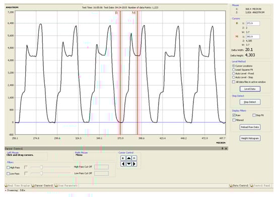 The scanning reticles made by amplitude and phase hybrid gratings were fabricated in accordance with the abovementioned steps in the laboratory. A photograph of the scanning reticle under an optical microscope is shown in Figure 15. The pitch period of the grating is 20 μm. The chrome-coated zones are the yellow strips in this photograph, while the red columns are the TiO2 film, and the black areas are the glass substrate as there is no reflective light. An alpha-step D-100 stylus profiler was employed to measure the height of the surface. The height of the chrome coating is about 200 nm, while the thickness of TiO2 film is 430 nm. By using such an arrangement, the phase of the incident light can be reversed by approximately . The protuberant part in Figure 16 is the overlay of the TiO2 and chrome coating. The reason for this phenomenon is due to the limitation of laboratory production technology; the accuracy of the alignment in step two is ±1 μm. To avoid missing the TiO2 film between the designed grating lines, as illustrated in Figure 3b, the coating area of the TiO2 film was deliberately enlarged. Since the chrome zones are opaque, the overlay should have little impact on the distribution of light. The fabricated scanning reticle should be qualified to conduct experiments.
