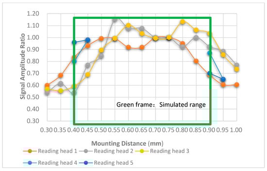 Five reading heads were fixed on the experimental bench to analyze the output electrical signals at each mounting distance. The mounting distance was adjustable from 0.30 mm to 1.00 mm with a step of 0.05 mm. The reading heads had a transverse relative motion of 0.1 m/s with the main scale so that the sine and cosine electrical output signals could be observed on the oscilloscope. At each mounting distance, the output electrical signals must generate a sinusoidal signal to be considered valid points. Reading heads 1–3 were the ones equipped with the scanning reticle made by the combination of amplitude and phase grating, while reading heads 4 and 5 contained the scanning reticle with amplitude grating. In the case where there were no sinusoidal signals captured, the selected distance was considered as not workable for the optical linear encoder and, thus, was not recorded in the diagram in Figure 19. The experimental results indicate that all reading heads 1–3 have sinusoidal signals from the distance between 0.30 mm and 1.00 mm. However, for reading heads 4 and 5, only at distances of 0.40, 0.45, 0.90, and 0.95 mm could the sinusoidal signals be observed. All these positions were recorded with the signal amplitude ratio as well. In practical applications, optical linear encoders can be functional when the signal amplitude ratio is 0.6 or higher. Based on the experiment results in Figure 19, reading heads 1–3 could be functional from a 0.45 to 1.00 mm mounting distance, while reading heads 4 and 5 were only functional at distances of 0.40, 0.45, 0.90, and 0.95 mm.