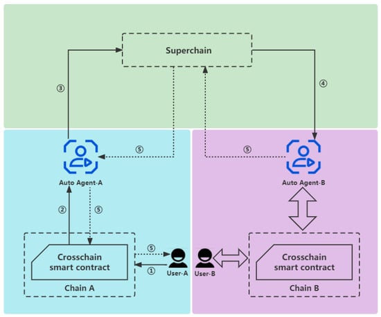 In order to achieve the access control and identity authentication of cross-chain transactions, we made some improvements to the process of cross-chain data circulation in Section 4, which requires authentication when receiving the cross-chain transactions sent by users or transferred by auto agents, so as to achieve access control. As shown in Figure 4, the detailed processes are as follows: