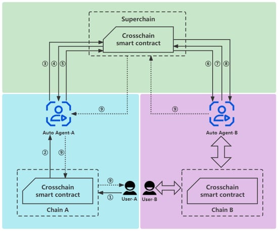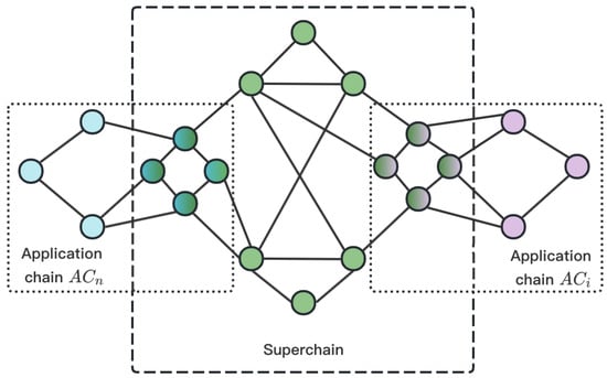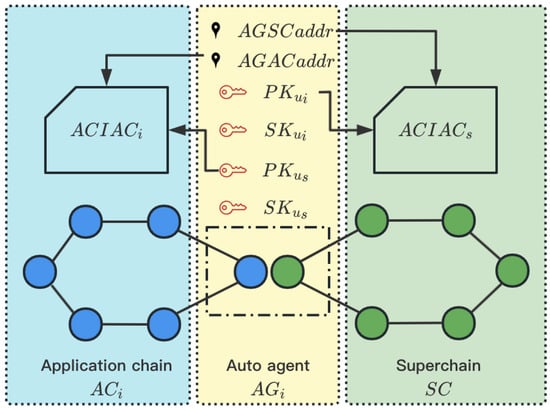 As shown in Figure 3, the blue nodes belong to and the green nodes belong to and is formed by one ’s node and one ’s node. After the processes of chain registration with access control and identity authentication, has restored and and has restored , and the corresponding , which realizes the registration of auto agents in Superchain and application chain.
