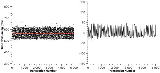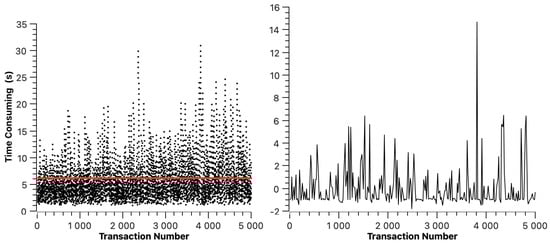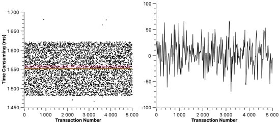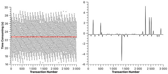 The transaction resolution time of ETH is shown in Figure 5. The red line indicates the average transaction resolution time, which is 6.11 s. In Figure 5, we can find that the transaction resolution time of ETH changes periodically. This is because, in the experimental environment, the average block generation time of ETH is 12 s to 14 s, which means that a transaction may be packaged at any stage of block generation, resulting in the periodic change in transaction resolution time. The right half of Figure 5 shows the dispersion of transaction resolution time.