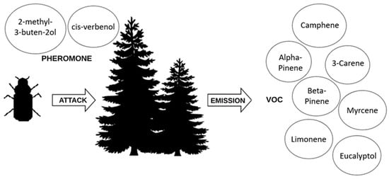 A simplified scheme—when a bark beetle attacks, trees secrete an increased amount of volatile organic substances; on the other hand, the male nesting in the tree starts to produce an aggregation pheromone from his body to attract females to mate.