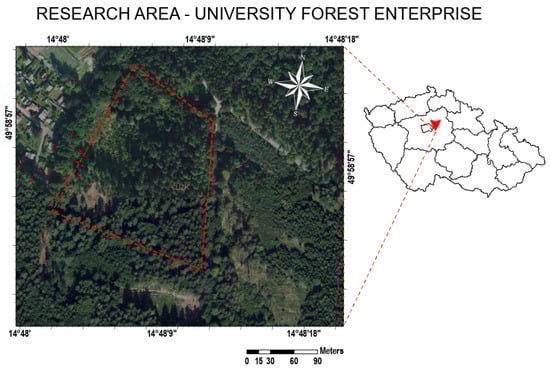 The study was conducted at the property of the University Forest Enterprise near Vyžlovka, southeast of Prague (Figure 2). The forest is used for forestry research and teaching, and the particular forest stand is a single-story with a density of stocking 0.8. Field experiments were established in a mixed stand, where the dominant stand is 80–100-year-old allochthonous Norway spruce with accessory species beech, oak, and maple []. The terrain is relatively flat, and the type of soil is brown soil, strongly acidic podzolized. The primary rock in the area is slightly (to medium) grained two-mica granite []. The study region is a slightly warm area characterized by an average yearly temperature of 8 °C and an average precipitation of 600 mm [].