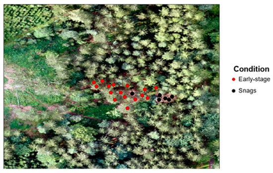The orthomosaic was created from images taken from the UAV DJI Mavic with a visible spectrum in channel R, G, B. The image shows a point layer of trees; black points represent snags, red points indicate an early-stage infestation of trees, on the left is a clearing area; the other trees were not attacked.