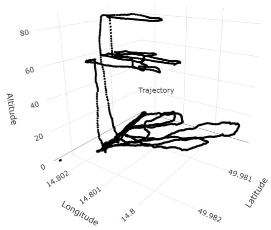 The trajectory of the sensor’s measurements. The measurement was first carried out on the ground level and then by an unmanned aerial vehicle—first; we descended just above the treetops (approx. 60 m), then we made a short flight at the height of 80 m.