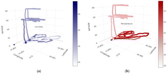 The measurement values for individual sensors were evaluated using Pearson’s correlation coefficient to determine the correlation between the distance from the trees and the value measured by the sensor. The assumption is that these values depend on each other; the closer we are to early-stage infestation trees/dead trees, the higher the values are measured by the sensors, thus representing a negative correlation coefficient. The weather affects the bark beetles’ activity, so measuring temperature and humidity is also important. The ideal temperature is around 25 °C without rain occurrence on data collection day. The 3D models represent humidity (Figure 6a) and temperature (Figure 6b) measurements during the entire data collection. Temperature and humidity significantly affect the spread of bark beetles; for example, the bark beetle is active at a temperature of 16 to 32 °C, and the optimum flight temperature is 22–26 °C (for searching for suitable host trees). In laboratory conditions, a relative humidity of 70% is used for growing bark beetles [,].